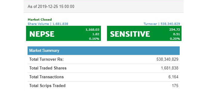 शेयर बजार मापक सूचक नेप्से आज १.८२ अंकले बढेर ११६८.०३ विन्दुमा पुगेको छ । आज १७५ कम्पनीको ५३ करोड ८३ लाख ४० हजार ८२९ रुपैयाँ बराबरको कारोबार भएको छ । १६ लाख ८१ हजार ८३८ कित्ता शेयर किन बेच भएका छन् ।