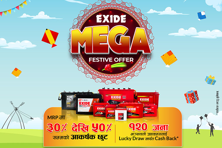 काठमाडौं । एक्साइड इन्डस्ट्रिजको नेपालस्थित आधिकारिक बिक्रेता सिप्रदी ट्रेडिङ प्रालिले चाडपर्व विशेष एक्साइड मेघा फेस्टिभ अफर सार्वजनिक गरेको छ ।